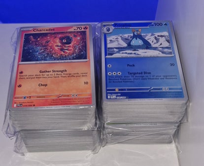 Billige bulkpakker av pokemon kort! Inneholder common, uncommon, reverse holo og holo. Tilfeldig utvalg fra forskjellige sett og engelsk eller japanske kort.